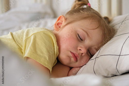 Peaceful adorable baby sleeping on a bed at home. Slumbering little child. Two years old girl sleeps peaceful at domestic room interior background. Serene dream. Cute face close up. Deep kid slumber