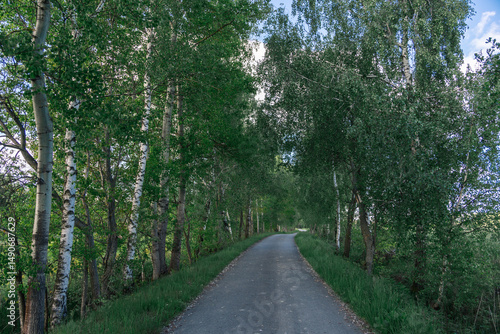 Peaceful Asphalt Road Through Spring Birches in a Calm Countryside Setting