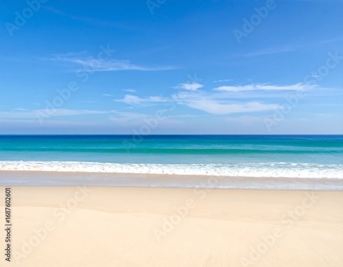 beach, ocean, sky, wave, sand, blue, turquoise, cloud, summer, calm, peaceful, horizon, water, shore, landscape, nature, vacation, holiday, relaxation, beautiful, view, sunshine, light, white, empty, wide, panorama, tranquil, colours, sharpened, soft, blurred, bright