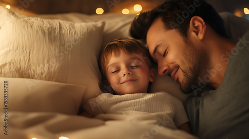 Peaceful Bedtime Moment Between Father And Son Sleeping Together, Loving Parental Bond And Nighttime Routine, Cozy Family Connection Captured In Warm Indoor Lighting