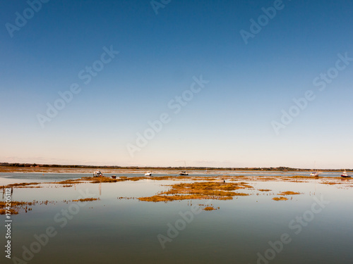peaceful blue space river estuary scene outside bright sunny day boats moored