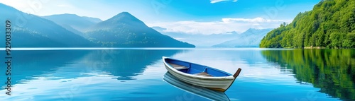 Peaceful boat on a serene lake with mountains and green forest reflections, idyllic nature landscape scene during a clear day.