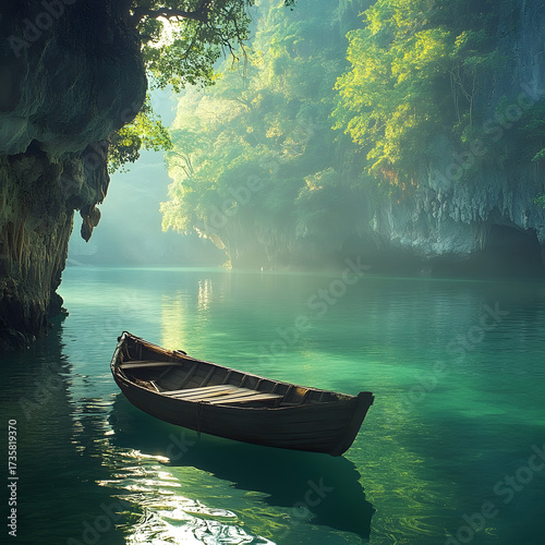 Peaceful boat scene near Raymen Cave, emerald green waters reflecting limestone cliffs, small wooden boat drifting toward the dark cave entrance, mist weaving through tropical trees along the shore,