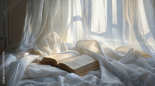 Peaceful Book on Bed with Morning Light. AI generated illustration.