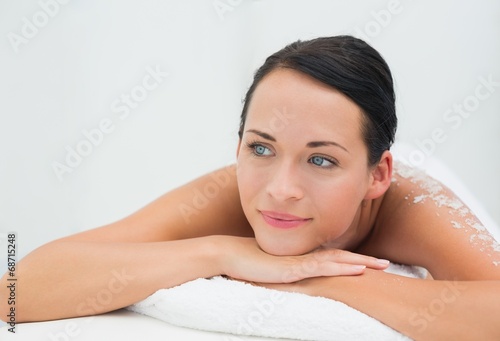 Peaceful brunette lying with salt scrub on back