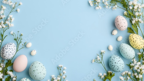 Peaceful Easter Eggs Layout in Pastel Hues Surrounded by Delicate Flowers on a Soft Blue Background for Spring Celebrations