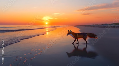 fox, beach, sunset, sunrise, animal, nature, landscape, coastal, wildlife, ocean, shore, water, sand, sky, silhouette, peaceful, tranquil, serene, calm, vibrant, colours, gold, dusk, dawn, evening, morning, outdoors, environment, seascape, coastline, golden hour, scenic, wilderness, wild, zoology, fauna