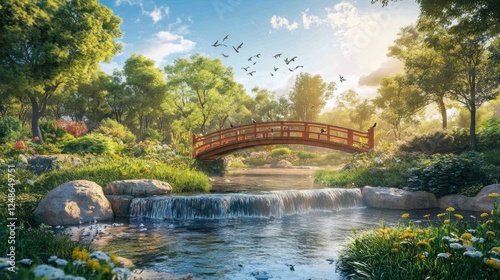 Peaceful garden bridge with waterfall