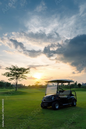 Peaceful golf cart at sunset in scenic golf course landscape