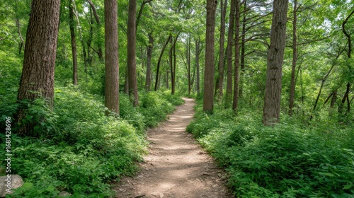 Peaceful Nature Trail Surrounded by Lush Green Trees and Vibrant Foliage in a Serene Forest Setting Perfect for Hiking or Relaxation