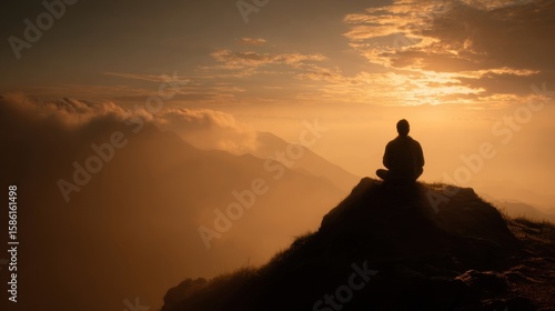 Peaceful person meditating on mountain peak during sunrise with clouds and breathtaking view.