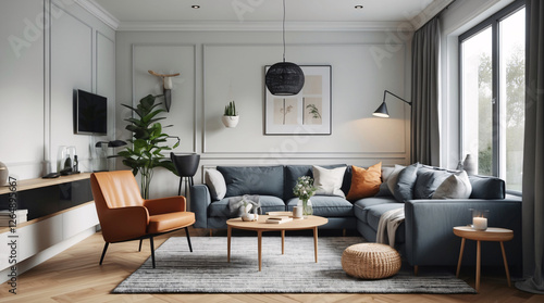 Peaceful Scandinavian inspired living room with neutral gray couch minimalist decor and natural light creating a harmonious space Modern Interior Design Inspiration