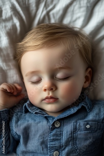 Peaceful Slumber An Adorable Toddler Boy Napping Peacefully, Resting in a Blue Denim Shirt