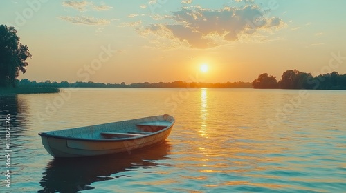sunset, lake, boat, peaceful, calm, water, nature, tranquil, summer, gold, horizon, scenery, evening, cloud, sky, serene, relaxing, picturesque, vacation, travel, tour tourism, fishing, boating, paddle, quiet, solitude, serenity, landscape, view, beautiful, idylli, charming, stunning, peace