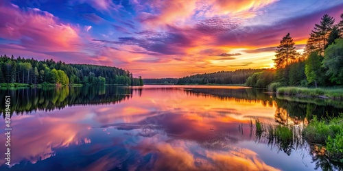 Peaceful sunset over serene lake surrounded by lush forests, reflecting hues of orange, pink, and purple on calm waters , sunset, lake