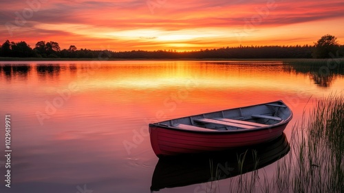 Peaceful sunset scene with vibrant orange and pink hues reflecting on a calm lake, a lone rowboat drifting in the water, ideal for relaxation photography
