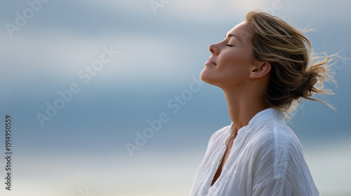 breath, woman, breathing, mindfulness, meditation, wellness, relaxation, calm, peaceful, serenity, health, mental, balance, fresh, air, nature, stress, harmony, lifestyle, beauty, sky, person, hair, summer, face, smiling, water, lady, outdoors, blue, smile, model, looking, wind, 1, joy
