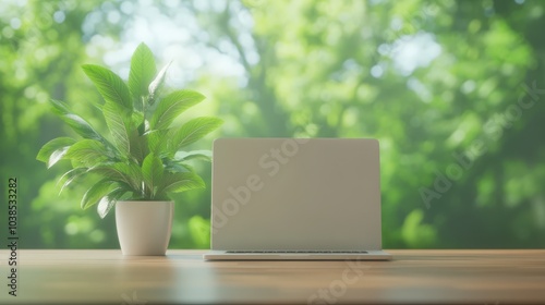 Peaceful workspace with laptop and plant