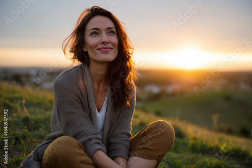 woman, sunset, nature, peaceful, relaxation, outdoors, smile, happiness, calm, serene, grass, sunlight, tranquil, thoughtful, beauty, casual attire, sitting, cosy, warm, evening, contemplation, lifestyle, freedom, contentment, natural, breeze, casual clothes, joy, harmony, scenic, landscape, youth, optimistic, reflective, wellness, countryside, person, alone, positive, mood