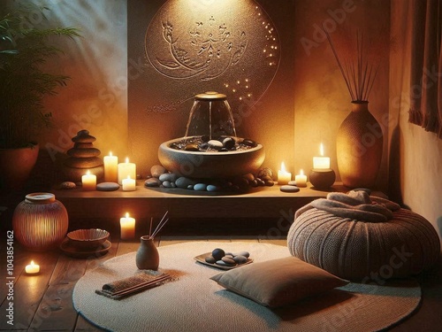 meditation, item, zen, room, candle, stone, water, fountain, relaxation, spa, interior, wellness, peace, calm, soothing, ambience, holistic, therapy, calmness, decor, design, harmony, soft light, spiritual, meditative, cosy, mindfulness, retreat, simplicity, balance, ritual, comfort