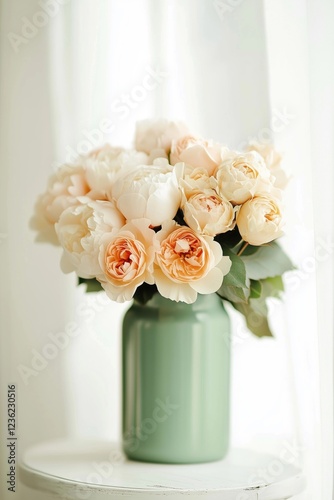 Peach and white peony roses placed in the teal can vase - style stock photography.