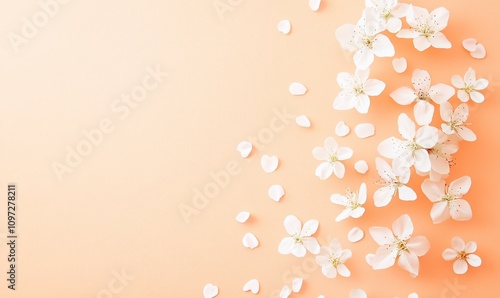 Peach background with scattered white blossoms and petals. Spring floral arrangement with copy space.