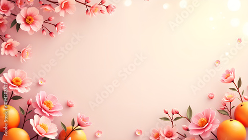 flower, blossom, peach, orange, pink, spring, background, floral, frame, border, design, celebration, chinese new year, festival, holiday, decoration, texture, pattern, pastel, soft, light, bright, beautiful, nature, fresh, happy, joy, romantic, elegant, invitation, card, wallpaper, graphic, illustration, three-dimensional, render, abstract, art, beauty, delicate, vibrant, auspicious, prosperity, luck, season, blooming, flower petals, tree branch