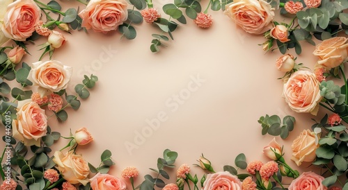 Peach Roses and Eucalyptus Floral Arrangement on a Beige Background