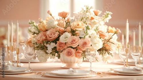 rose, wedding, centrepiece, peach, flower, elegant, reception, table, decor, floral, arrangement, romantic, bridal, party, celebration, event, design, luxury, tableware, setting, dinner, feast, rustic, vintage, reddening, pink, white, cream, beautiful, fresh, bloom, bouquet, vase, candle, gold, tablecloth, goggles, plate, cutlery, style, image, photo, occasion, ceremony