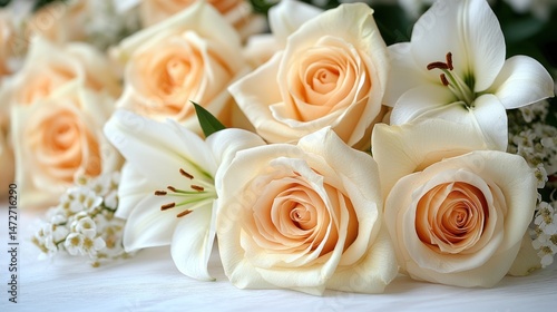 rose, lily, bouquet, wedding, flower, peach, white, floral, arrangement, closeup, blossom, bloom, flower petals, romantic, elegant, beauty, nature, spring, summer, love, celebration, romance, bridal, delicate, pastel, soft, gentle, pretty, fresh, vibrant, fragrant, design, background, texture, image, photo, picture, illustration, graphic, art