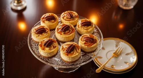 Peanut butter cheesecake Indulge in the delightful allure of pecan tarts, each a miniature masterpiece of buttery crust, creamy filling, and crunchy pecans, arranged on a glass stand.