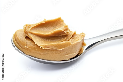 Peanut butter with metal spoon isolated on white background