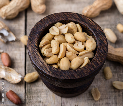 Peanuts in small dark wooden bowl on natural rustic desk.