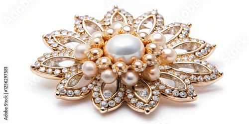 brooch, pearl, flower, jewellery, gold, white, background, isolated, accessory, fashion, design, ornate, elegant, style, gem, sparkle, shine, lustrous, delicate, craftsmanship, detail, object, macro, closeup, studio, shot, image, photo, product, high key, lighting, faceted, pendant, gaud, adornment, precious, luxury, decorative, motif, metal, setting