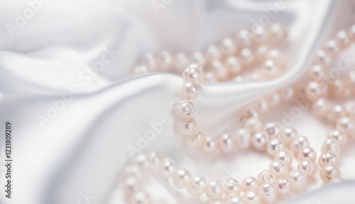 Pearl necklace over white silk background, close up. Beautiful Natural pearls beads, elegant accessories. Wedding concept, Valentine's Day Gift.