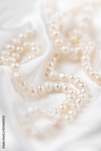 Pearl necklace over white silk background, close up. Beautiful Natural pearls beads, elegant accessories. Wedding concept, Valentine's Day Gift. Vertical image