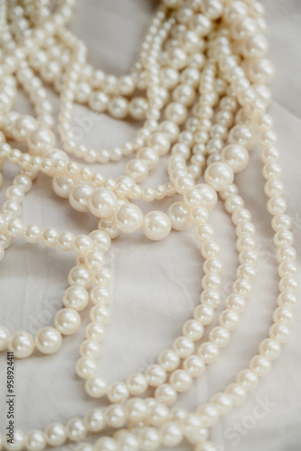 Pearl necklace. Shiny background of jewelry. Royal luxury pearl beads