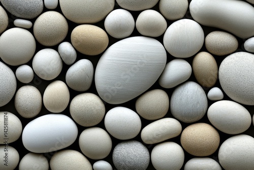 Pebbles of various sizes and colors are arranged in an abstract pattern, creating a textured background with natural tones of beige, white, pink, gray, brown, or light orange. The pebble texture