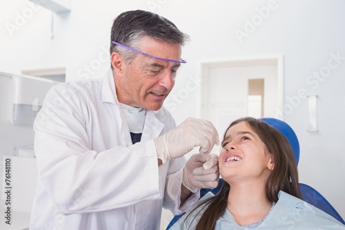 mature adult, man, male, caucasian, children, girl, female, dental hygiene, hygiene, patient, exam, clinic, sterile, dentistry, appointment, dentistry, check-up, wearing, bib, cute, childhood, dentist, labcoat, flossing, flossing, indoor