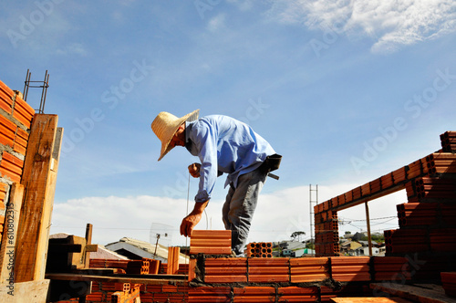 pedreiro construtor edificando parede de tijolos em obra