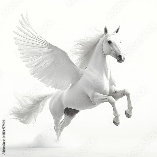 Pegasus captured in flight, its powerful legs tucked and wings beating elegantly, isolated on a bright white background for a clean and timeless look.