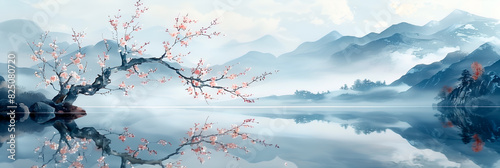 Peinture d'un paysage de montagnes et brume sur un lac avec un cerisier en fleurs