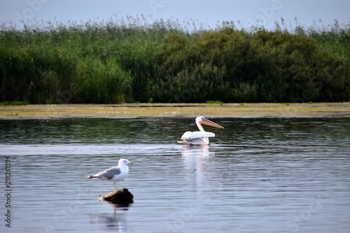 Pelican & Gull in the Danube Delta Biosphere Reserve, Romania, Europe