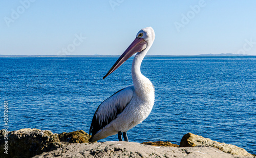Pelican standing in front of the bright blue sea in the midday sun at Amity Point Stradbroke Island Australia