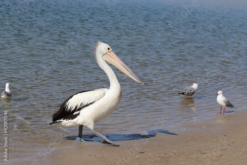 pelicans on the shore