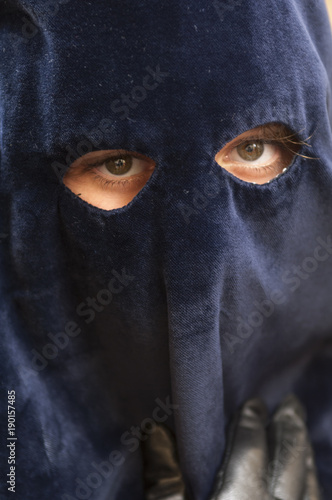 photo, vertical, seville, andalusia, spain, spanish, southern, religion, religious, catholic, christian, church, semana santa, easter, tradition, procession, brotherhood, penitent, cross, spiritual, prayer, pray, faith, believer, fervour, jesus christ, jesus christ, festivity, trip, travel, tour tourism, spring, mask, hood, portrait, annoyance, sister, tunic, hidden, badge, wax, candle, wick, flames, eye