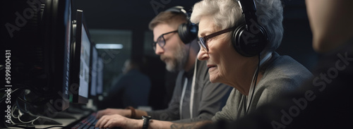 pensioners learn computer literacy. man and a woman wearing headphones while sitting at a computer. Generative Ai