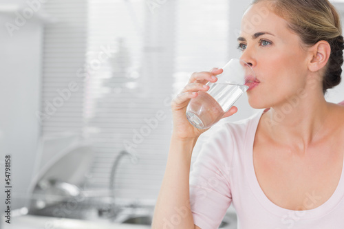 30s, woman, female, caucasian, indoor, looking away, home, house, household, homelike, apartment, domicile, abode, kitchen, happy, smiling, cheerful, blond, fair hair, lifestyle, leisure, casual attire, pretty, attractive, holding, glasses, water, calm, peaceful, relaxing, content, drinking, sipping