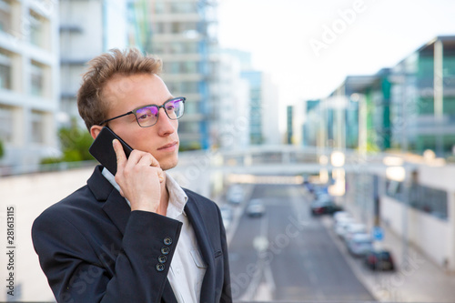 Pensive bored manager talking on cellphone outside and looking into vacancy. Young man in office jacket and eyeglasses standing in city street and speaking on mobile phone. Phone call concept