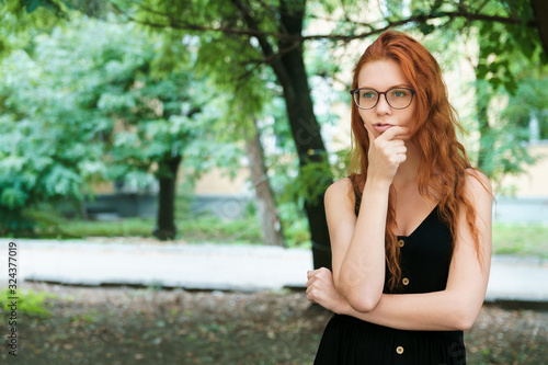 Pensive girl student in glasses walks in park. Ginger girl outdoor, copyspace.